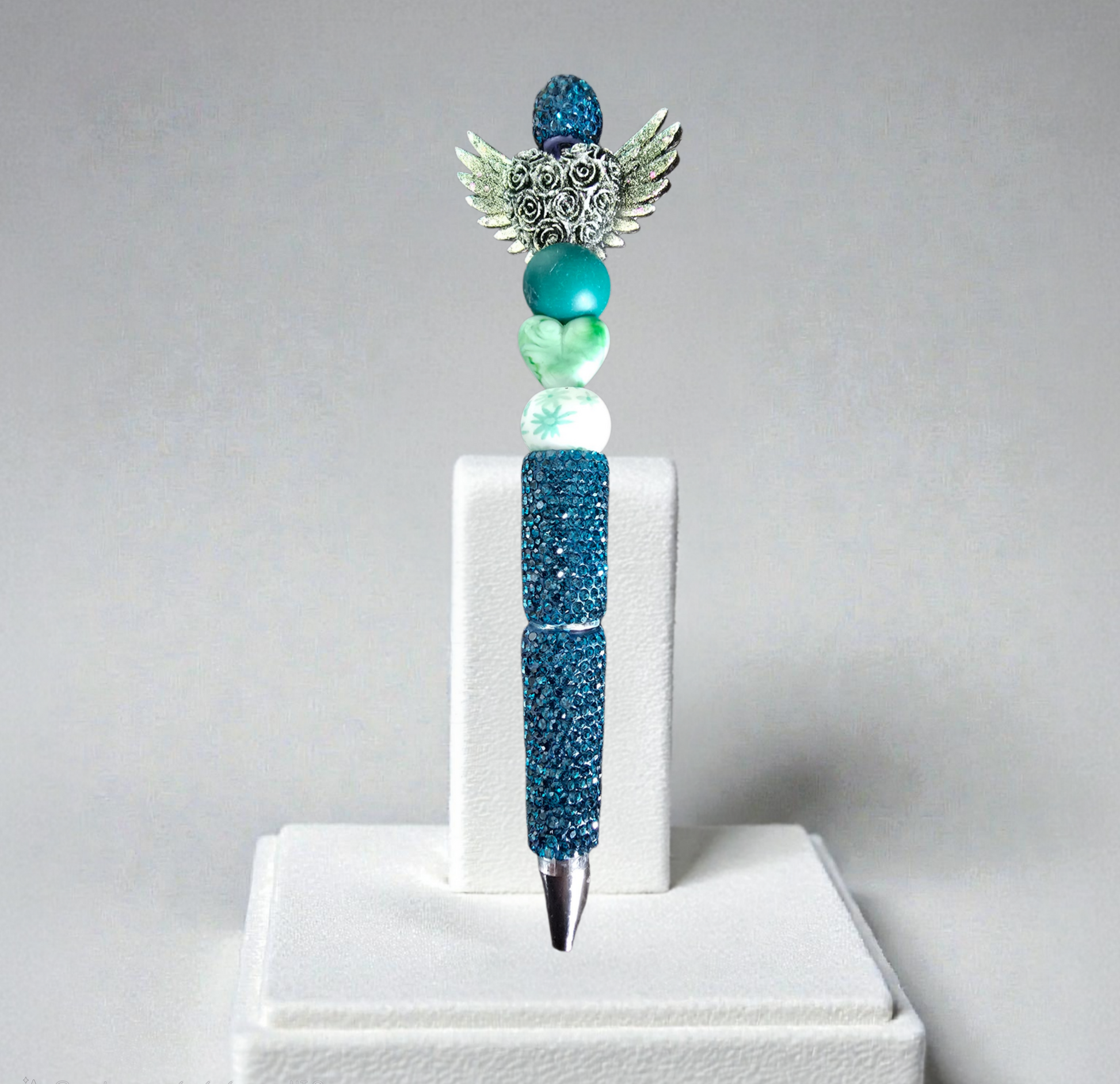 Stylo strass fait main cœur d'ange vert irisé et phosphorescent 🩵